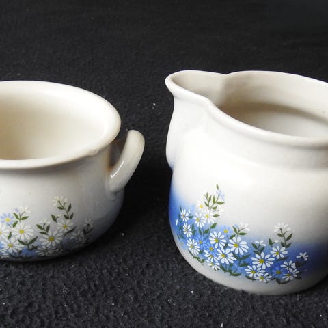 Mugg. Porslin flerfärgad med blommönster och guldfärgat handtag