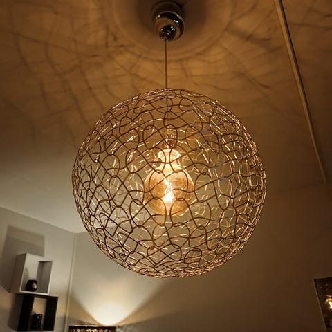 Den sfäriska lampskärmen av trälameller i kombination med en stabil stålram ger varje rum en harmonisk och inbjudande atmosfär.