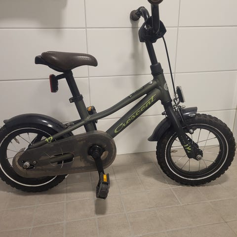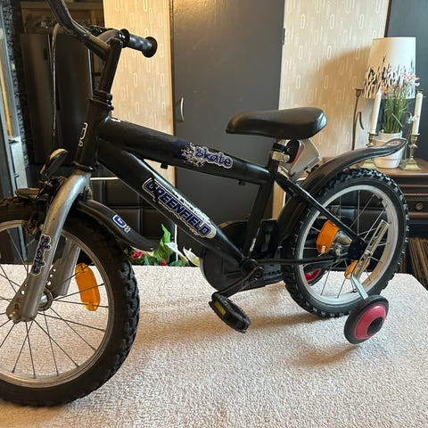 Stoy barncykel med 12" hjul i svart färg. Cykeln är utrustad med stödhjul och har fotbroms samt handbroms fram. Passar mindre barn som ska lära sig cykla eller som första cykel efter springcykel. Ram och gaffel är i metall och cykeln har kedjeskydd för ökad säkerhet.