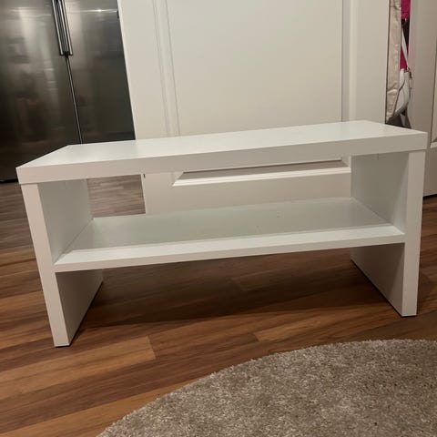 Stabil och funktionell mindre TV-bänk från IKEA i björkfanér. Den har några år på nacken men är i gott bruksskick. Det finns en solblekt fläck på ovansidan samt några mindre repor, vilket också återspeglas i priset. Hyllplanen går att ändra höjdmässigt.