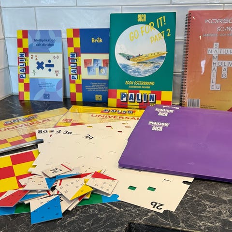36 st. oanvända och inplastade vita magnetskyltar medföljer för att skriva egen text eller rita symboler.