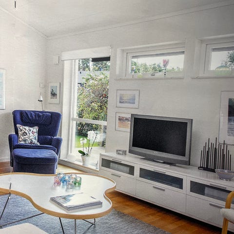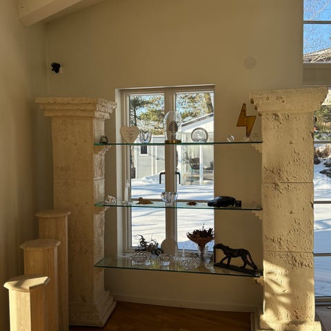 Platsbyggd glasvitrin/avdelare, specialritad och insatt i samband med husets 60/70-talsrenovering.