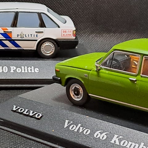 Volvo V70 Touring och Saab 9-5 Aero modellbilar i metall, skala 1:72. Bilarna är monterade på märkta socklar med modellnamn och skala.