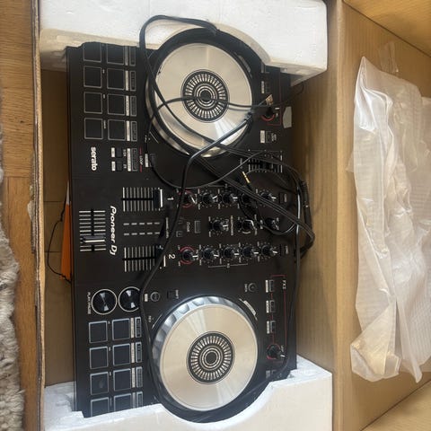 Pioneer DDJ-200 DJ-kontroller i svart utförande. Kontrollen har två joghjul, flera performance pads, tempo- och volymreglar samt EQ- och filterrattar. Enheten är avsedd för digital DJ-användning tillsammans med dator, surfplatta eller annan kompatibel ljudkälla via USB-anslutning. Lämplig för mixning, cueing och enklare effekthantering vid hemmabruk eller mindre evenemang.