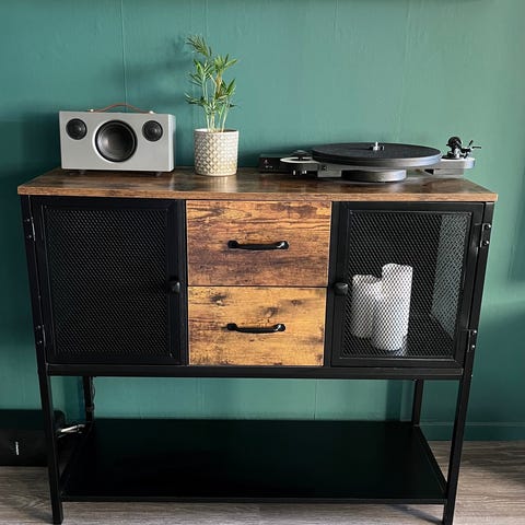 Förvaringsskåp från serien Nett i industriell design! Det här skåpet är tillverkat i svart stål med nätluckor. Skåpet har två hyllplan med fyra luckor