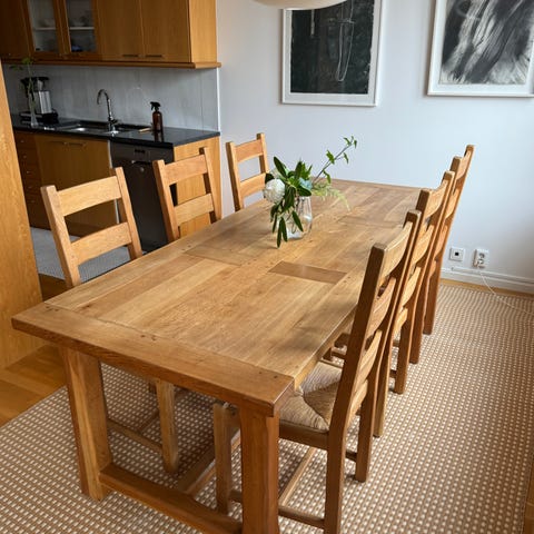 Matbord + 6 stolar säljes i paketpris. De är köpta från Bror perhssons möbler, fint skick.