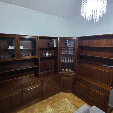 Den är uppbyggd i totalt sex delar som går att plocka isär. Tre bottendelar med skåp och lådor, två överdelar med bokhyllor och en överdel med vitrinskåp.