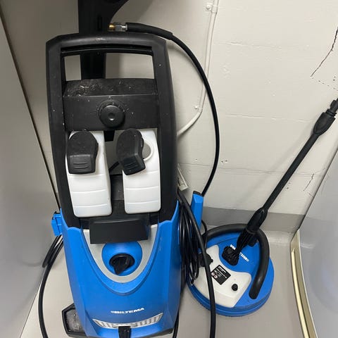Nilfisk högtryckstvätt i blå färg med hjul och handtag för enklare förflyttning. Utrustad med slangvinda framtill och elsladd som kan rullas upp på hållare. Passar för rengöring av exempelvis uteplats, fordon och trädgårdsutrustning. Högtryckstvätt Nilfisk Core 150-10 PowerControl PA EU (nypris 3000kr)