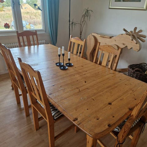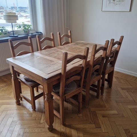 Matsalsbord med 1st inläggsskiva + 10 stolar, lampa ingår