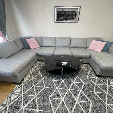 Det är en stor och fin U-soffa i ljusgrå. Inga synliga fläckar eller skador. Det ända är en liten skada under ena sitsen som blev vid en flytt. Inget som förstör funktionen eller syns, se bild!