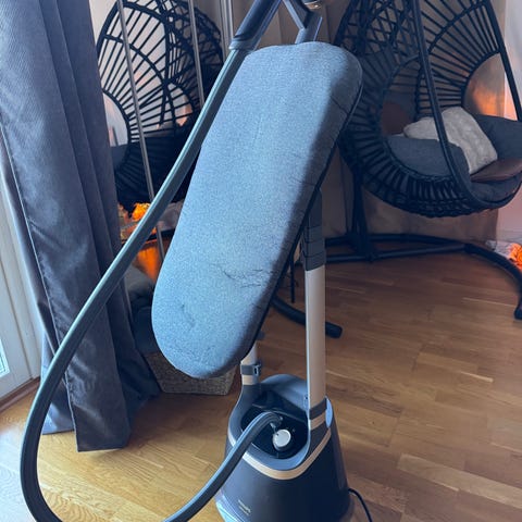 Tefal ångstation vertikal strykbräda i svart utförande. Produkten kombinerar en upphöjd, justerbar stryk- och ångbräda med en integrerad ångstation. Den är avsedd för vertikal och horisontell ångning och strykning av kläder och textilier. Basen rymmer vattenbehållare och ångfunktion, medan den vadderade brädan ger stöd för plagg. Passar för användning i hemmet för vardaglig klädvård och uppfräschning av textilier.