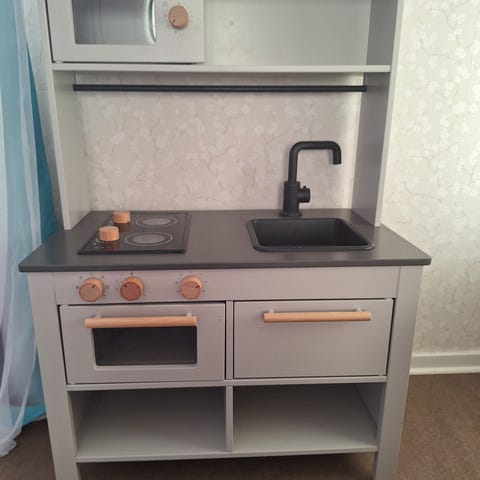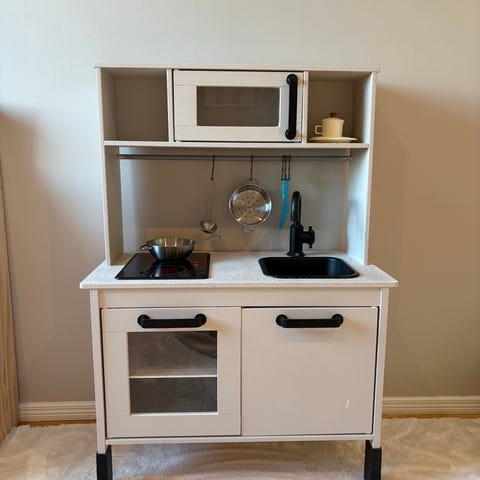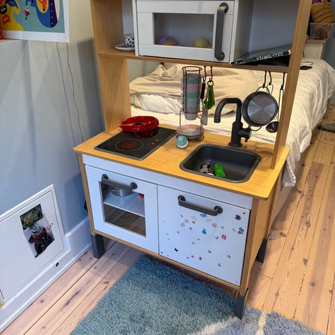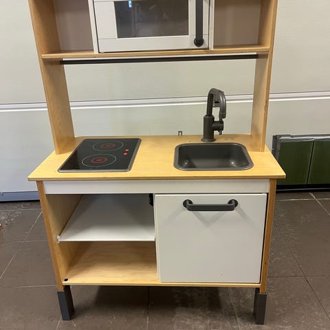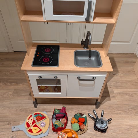 IKEA leksakskök för barn med flera tillbehör. Köket är i trä med diskho, spisplattor, ugn och förvaringsutrymmen. Till köket hör bland annat leksaksmat i tyg, träleksaker som glassar och bakverk, leksaksservis samt en mindre leksaksmixer. Passar för inomhuslek i barnrum eller lekhörna.