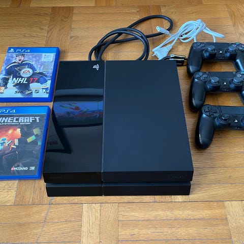 Ps4 spelkonsol 500gb i svart färg med tillhörande blå trådlös handkontroll. I annonsen ingår även strömkabel och kabel till kontroll. Fyra fysiska PS4-spel i originalfodral följer med: Injustice 2, Tom Clancy’s The Division 2, NHL 18 och Watch Dogs 2.