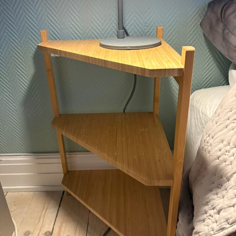 Säljer en praktisk och stilren hörnhylla från IKEA i massiv bambu. Perfekt för att utnyttja hörn och skapa smart förvaring utan att ta upp mycket plats.