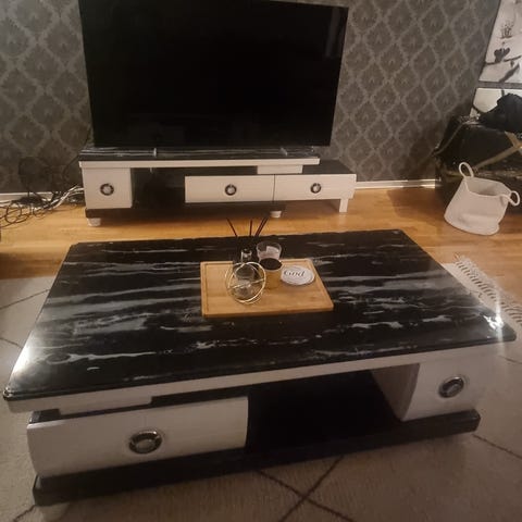 Säljer vår smidiga praktiska tv bänk på hjul. Den är i grå färg. Den består utav trä med metallben och en flyttbar glasskiva som kan ställas in i 3 nivåer. Lätt att rulla runt.