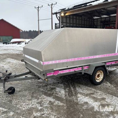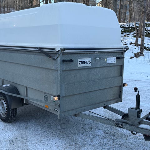 Släpvagn med kåpa. Utrustad med uppfällbart kåplock för skyddad last. Lämplig för transport av olika typer av gods som behöver stå skyddat under färd.