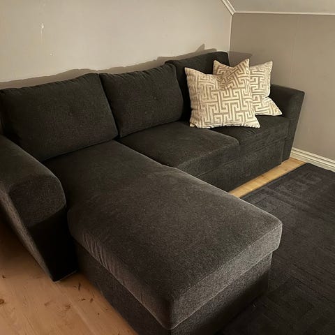 L-formad soffa med divan i mörkgrått tyg. Vändbar divan (kan placeras på valfri sida). Tyget är avtagbart och kan tvättas i maskin.