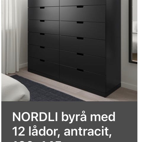IKEA byrå med nio lådor i grå färg. Byrån har tre mindre lådor överst och sex större lådor nedtill, samtliga med runda knoppar. Passar för förvaring i till exempel sovrum, vardagsrum eller hall. Design av Anders Pehrson.