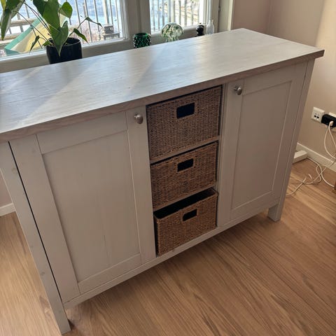 IKEA konsolbord i vitt utförande. Bordet har en ovansida för avlastning samt en hylla undertill för extra förvaring. Överst finns två lådor med runda knoppar för förvaring av mindre saker. Passar till exempel i hall, vardagsrum eller sovrum som avlastningsbord eller sidobord.