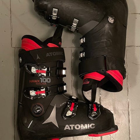 Nordica skidpjäxor i svart med röda detaljer. Pjäxorna har fyra spännen för justering och är avsedda för skidåkning.