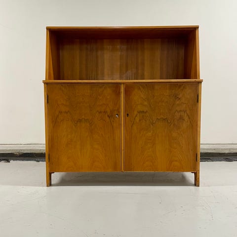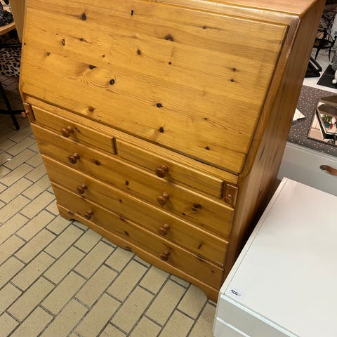 En sekretär i teak som är väl använd. Rigoröst byggd med små lådor när man fällar ut locket. Nyckeln är borttappad, vilket gör det svårare att öppna lådorna – där av det låga priset.