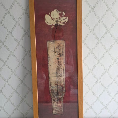 Från danska Incado kommer här en tavla med titeln Cayenne, av konstnären Ivo. Motivet är en blomma i vas mot röd bakgrund. Rektangulärt format träram med måtten 27x80 cm, upphängning på baksidan. Passar exempelvis i hall, vardagsrum eller sovrum.