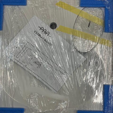 En vit spolknapp för dubbelspolning tillverkad i plast för frontmontering på Triomont XS. Spolknappen monteras på fixturen på väggen ovanför den vägghängda toaletten och fungerar som servicelucka.