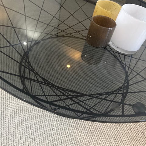 Runt bord med två skivor i tempererat glas och ben i metall (silver/svart) som snabbt kan förvandlas till ett helt nytt bord.