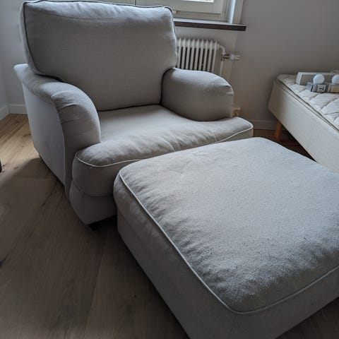 Säljer min Gia fåtölj i linne från Pastill.