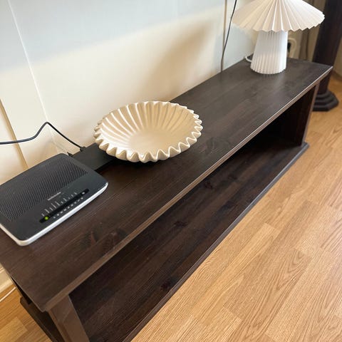 Jysk hylla. Hyllan har tre hyllplan i träimitation och svart metallstomme.