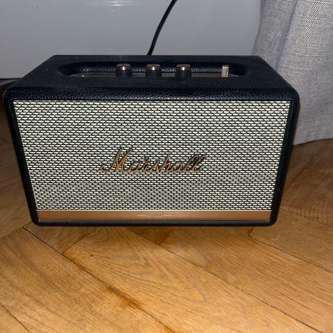 Marshall högtalare i beige utförande. Modellen har klassisk Marshall-design med frontgaller och logotyp på framsidan samt kontrollpanel på ovansidan med reglage för volym, bas och diskant samt ingångsväljare. Passar för uppspelning av ljud från exempelvis mobil, dator eller annan ljudkälla i hemmet.