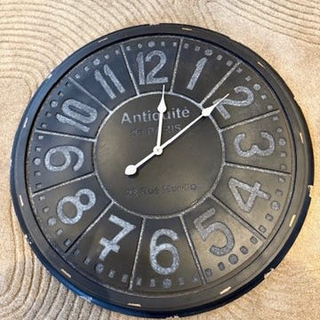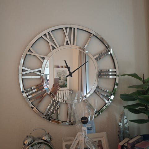 Kvadratisk väggklocka i vit färg med spegel ram. Urtavlan har romerska siffror och två visare för timmar och minuter. Klockan är avsedd för väggmontering och passar i exempelvis vardagsrum, hall eller kök.