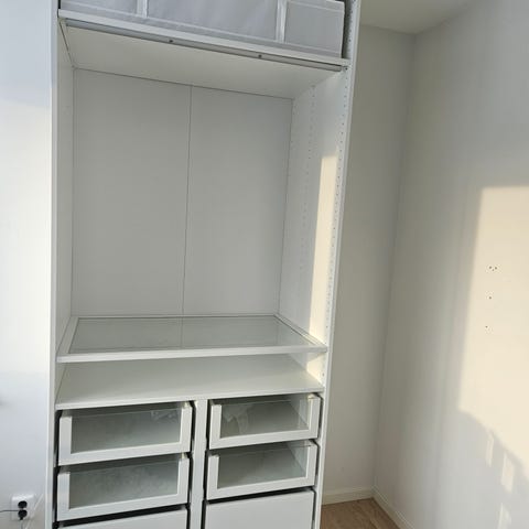 säljer min ganska nya garderob (OBS! endast den åt höger, vänster säljs inte) den är 100cm, och 236 cm lång. Köptes förra året och är väldigt fin och fräsch men säljs pga flytt. Finns att hämta i Kumla och köparen står för utbärning osv. Skohyllan där nere är liiite trög men märks inte och kan dras ut utan problem men den går inte in hela vägen, skiljer sig ksk 1-2 cm men inget som syns.