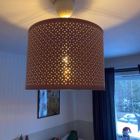 Vit perforerad skärm med guldfärgad insida som ger ett varmt, mjukt och väldigt trevligt ljus. Riktigt fin när den får ta plats.