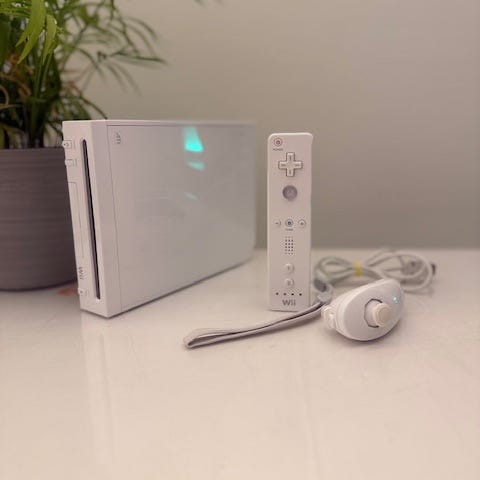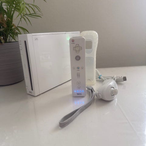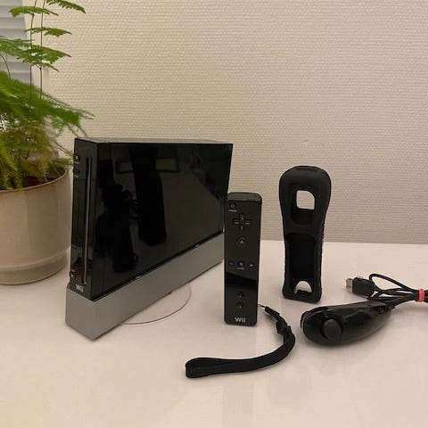 Konsolen är i utmärkt skick, den är funktionstestad och fungerar som den ska. Levereras med en originalkontroll och en nunchuck, med alla nödvändiga kablar, samt en HDMI-adapter så att du kan ansluta till en smart-TV.