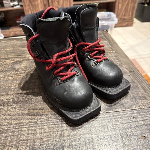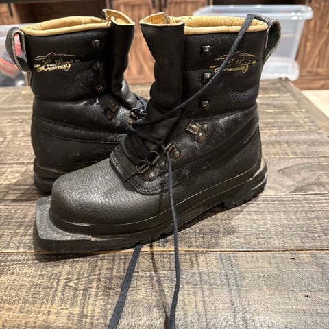 Garmont kängor i svart läder med röda skosnören. Kraftig sula med grovt mönster ger bra grepp. Ovandel i läder med metallöglor för snörning. Passar för utomhusbruk som vandring eller annan aktivitet där stabila kängor behövs.