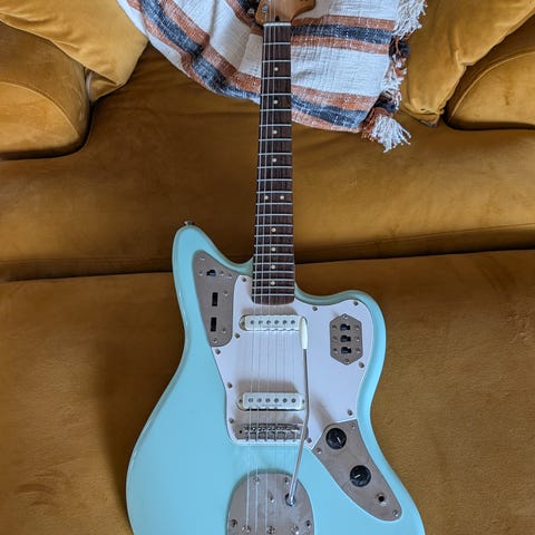 Specialare som förutom den coola "holografiska" glitterlacken är bestyckad med två humbuckers, hardtail-stall och coolt bakvänt huvud.