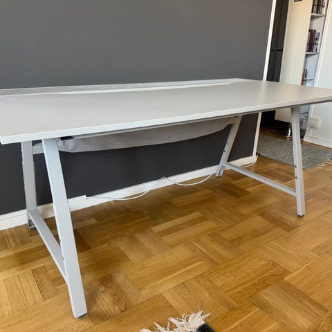 IKEA Utespelare skrivbord för gaming i svart färg med måtten 160x80 cm. Bordet har en rektangulär bordsskiva och benställning i metall med krysstag för stabilitet. Höjden kan justeras i flera lägen enligt måttangivelserna på ritningen. Konstruktionen är anpassad för datoranvändning och gaming med gott om utrymme för skärm, tangentbord och tillbehör. Minimala färgstänkar lite på bordet.