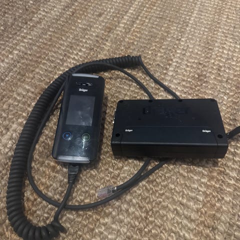 Dräger Interlock 7500 alkolås med handhållarenhet och styrenhet. Den köptes i februari 2024 så den är godkänd för att användas för ett villkorat körkort i några år till. (Se inköpsdatum på kvittot)