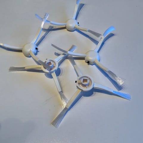 Reservborstar till robotdammsugare i plast med tre armar och grå borststrån. Borstarna monteras under robotdammsugaren och används för att föra in damm och smuts mot insuget, särskilt längs kanter och i hörn.