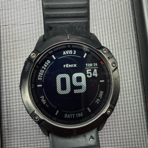 Garmin Fenix 6X Sapphire smartwatch i svart utförande. Klockan har robust boett och svart silikonarmband med justerbar längd. Baksidan visar optisk pulssensor och kontakt för laddning/dataöverföring. Modellen Fenix 6X Sapphire är en multisportklocka med GPS/multi-GNSS-stöd och safirglas enligt märkningen på baksidan. Passar för användning vid träning, vardag och utomhusaktiviteter där pulsmätning och satellitnavigering efterfrågas.