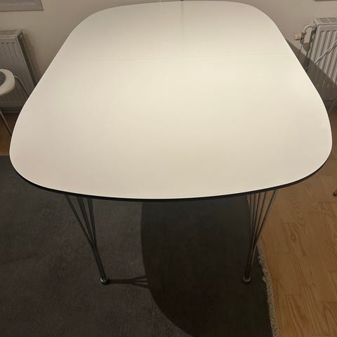 Vitt matbord med kromade ben 105x200 cm. Vit laminat med naturkant. Varumärke: Haslev. Det går att köpa till en inläggsskiva och då blir bordet 48 cm längre.