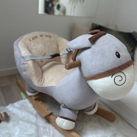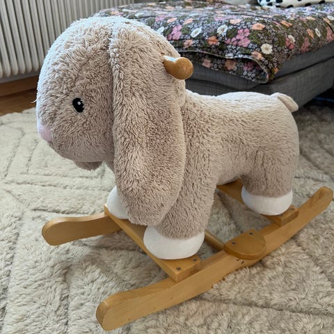 gunghäst i form av ett rådjur. Sittdelen är ett mjukt plyschdjur monterat på en stabil gungställning i trä. Trämedar och handtag ger stöd vid gungning. Passar som leksak för små barn och som inredningsdetalj i barnrum. Färg i ljusa, neutrala toner.