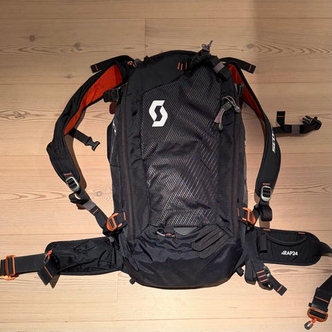 BCA Float 32 lavinryggsäck med cirka 32 liters volym i röd och svart färg. Ryggsäcken är utrustad med lavinairbag-system och har en extra tub som inte är fylld för närvarande.