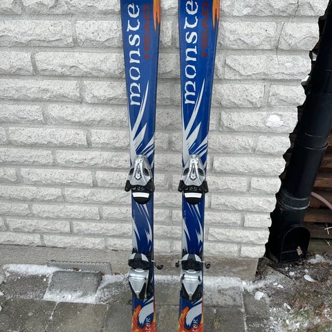 Head skidor med bindningar i vit och blå färg. Passar för utförsåkning i pist.