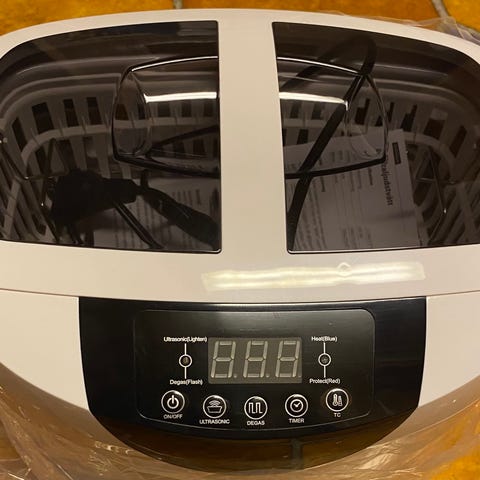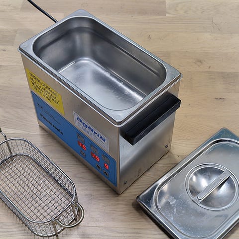 Ultraljudstvätt från Runyes, modell CLEAN-01. Den har en tankkapacitet på 3.0 liter och en digital timer med olika inställningar. Flera tillbehör medföljer.