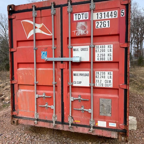 GBIC 17197 LR/2015 fraktcontainer i stål, röd och grön färg. Containern är avsedd för transport och förvaring av gods och är godkänd enligt CSC-säkerhetsbestämmelser. Utrustad med dubbla dörrar med flera låsbeslag och vertikala låsstänger för säker stängning. Passar för lagring eller transport av olika typer av material och utrustning.