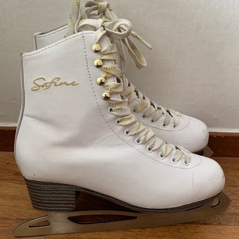 Risport skridskor i vit färg, storlek 37. Klassiska konståkningsliknande skridskor med snörning framtill och tåtagg på skenan. Passar för åkning på is, exempelvis i ishall eller utomhus på plogad is. Skorna är höga i modellen och ger stöd runt fotled och vrist. Skenorna är monterade på svart sula med metallfästen.