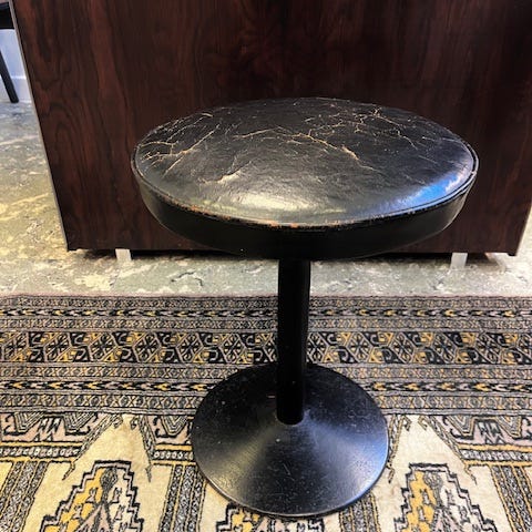 1 retro pall ur serien Satellit som formgavs av Johanson Design i Markaryd på ca 1970-talet. Stomme i lackad metall och klädsel i skinnimitation. Fint skick för sin ålder, se bilder för egen uppfattning. Några tryckmärken finns i sitsen men inga hål eller skador. Ca 50 cm hög, diameter ca 46 cm. Finns i Sätila, Marks Kommun men kan levereras till Göteborg mot erlagd handpenning.