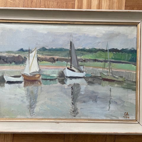 Fougstedt väggmålning med motiv av fiskare och fiskenät. Målningen är signerad "G. Fougstedt -55" i nedre del. Flera personer och fiskeredskap avbildas i dämpade, pastellartade färger. Verket är utfört direkt på väggpanel eller skiva och täcker en större väggyta. Passar som dekorativ väggkonst i exempelvis vardagsrum, hall eller offentlig miljö där ett marint tema önskas.